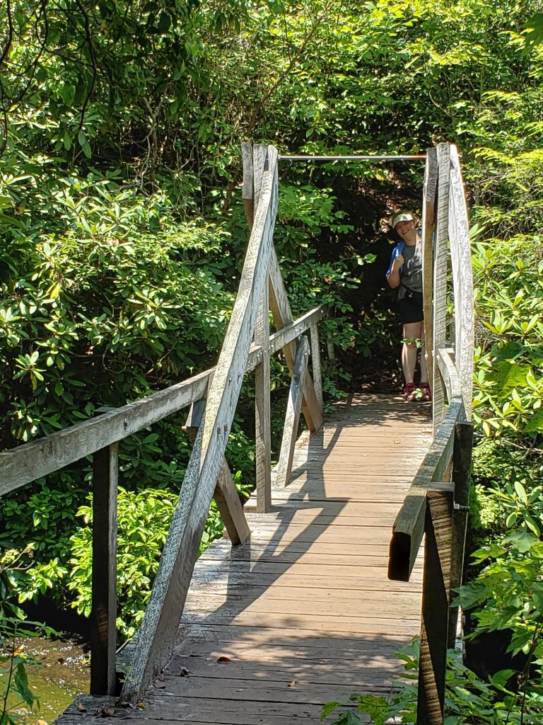 Nataliya is rarely one to pause and savor the moment (which is my preference), but she surprised me by suggesting that we stop to cool off in the Cane Creek, which we had crossed over on our final approach to the falls. The creek also has a weathered bridge across it that rests a top a large flat rock shelf. We put our gear and shoes down on the shelf and walked barefoot in the shallow, cool water which was very refreshing. After cooling off, we headed back to our car.