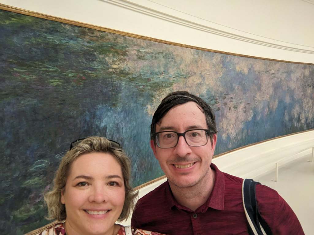 After refueling, we took a quick walk through the Tuileries Garden to the Orangerie Museum (about $13 but also eligible for the Museum Pass) to see Claude Monet’s famous Water Lillies series of paintings. The Museum Pass let us skip the line which is another great benefit! The Orangerie is a specialized greenhouse (which grew oranges and other fruit trees) of the former royal Tuileries palace. The Water Lillies are displayed in two custom-built elliptical galleries designed to give the viewer an illusion of “wave without horizon and without shore.” The paintings depict lilies in the garden of his home in Giverny, about 50 miles northwest of Paris (a popular day trip destination). I love the paintings because they showcase Monet’s use of layering and texture to capture the surface of the water.