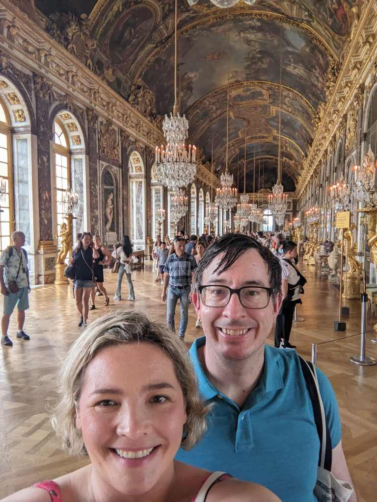 While the conference was a success, the next day started out with a string of setbacks! Our first destination was the magnificent palace of Versailles; however, the most convenient train station was closed so we had to use another station. It wasn’t much further away but numerous problems beset us along the way. When we arrived, it had started to rain, but neither of us had a raincoat or umbrella (despite only a 10% chance according to the weather app)! We tried to find a store that sold one, but we were already drenched by the time we found one at a pharmacy. Then, I left my phone at the cash register when we left! Thankfully I noticed almost immediately, and nobody had stolen it by the time I arrived back at the store. My GPS was very unreliable, so we wandered around Versailles trying to find a café ro re-energize. We stumbled upon the Stray Bean which provided some respite and refreshment. We were already very frustrated and tired before we even arrived at the palace! I felt like this was going to ruin the whole day and maybe even spoil the remainder of the trip, but thankfully it didn’t!