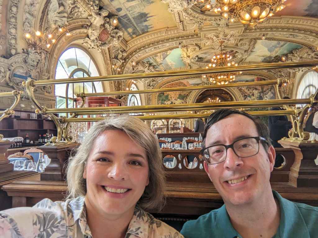 Before dashing off to the next attraction, we stopped for a quick lunch at Le Train Bleu – a famous restaurant in the Gare de Lyon train station. Le Train Bleu began as the station’s buffet to serve visitors for the Universal Exposition of 1901. It was renamed in 1963 for the iconic overnight train that connected Paris to Cote d’Azur / French Riviera along the Mediterranean. The grand crystal chandeliers, polished parquet floors, wall frescoes, and gilding transport diners back to the Belle Epoque of the late 1800s and early 1900s. The frescoes highlight the leisure of visiting southern France and its colonies in North Africa.